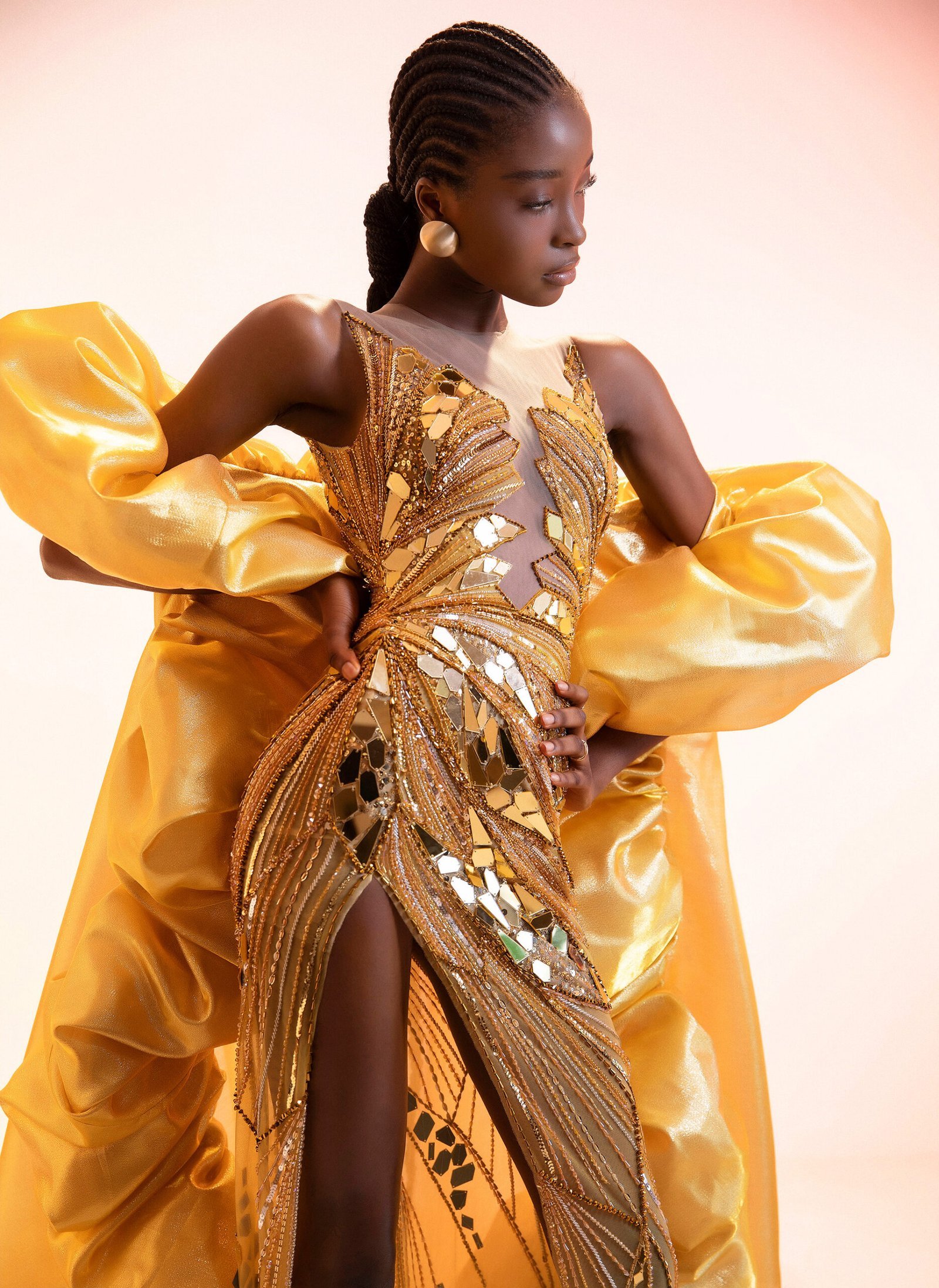 The dress has a deep V-neckline and appears to be made from a sheer fabric base, completely covered in exquisite gold sequins and beads. The beading forms a swirling, intricate pattern that cascades down the dress. A high side slit adds a sensual and modern touch.