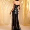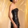 This dramatic black gown is a captivating blend of edgy and elegant. The strapless bodice features a corset leather. The dress is crafted from delicate black tulle, creating a layered effect. The flowing, ethereal layers of tulle add a soft, romantic contrast to the bold, beaded bodice.