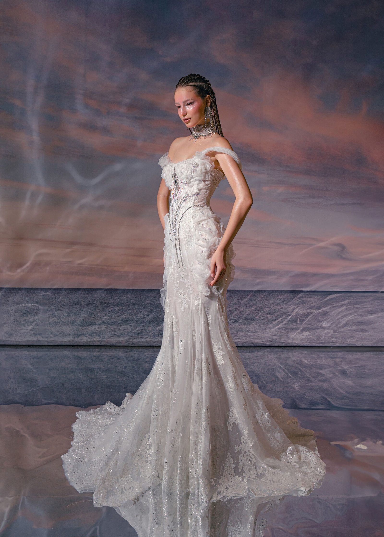 Off white Rhinestones beading Designer Mermaid Dress