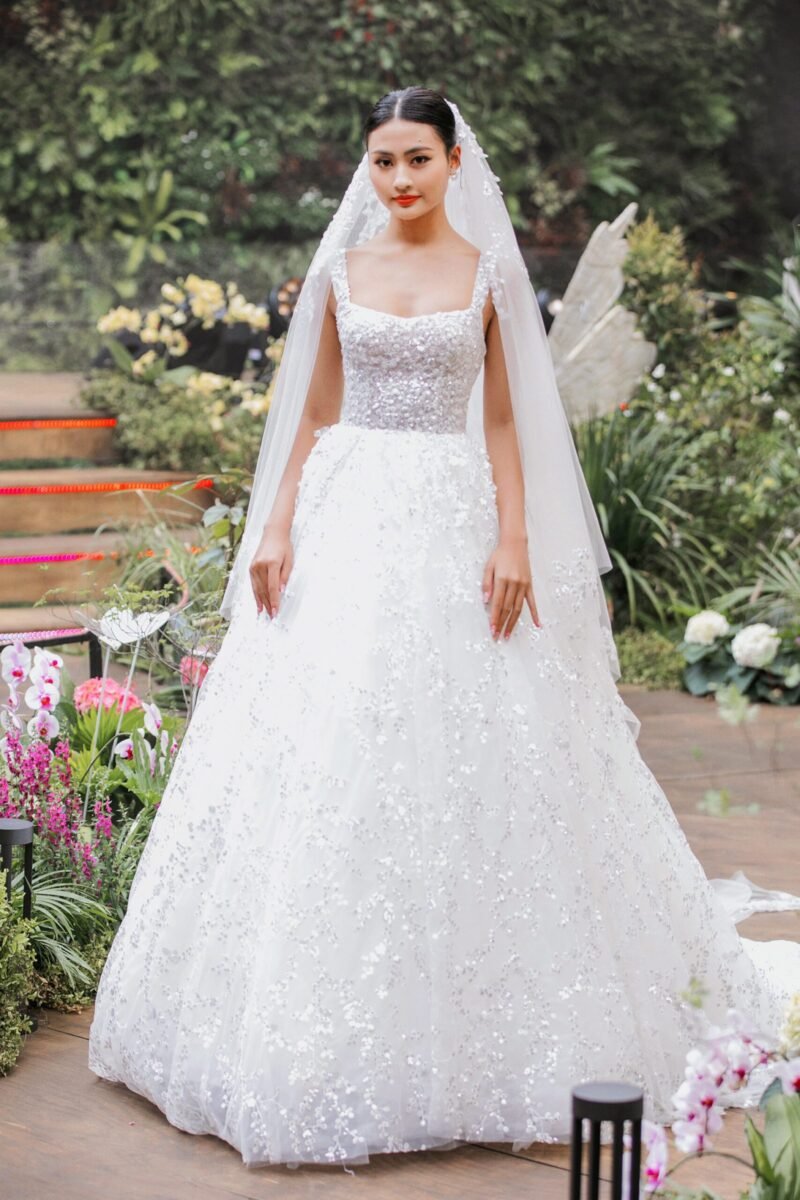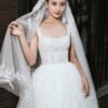 This wedding gown draws inspiration from the tana daisy a timeless symbol of purity and grace. Crafted from airy tulle in pristine white, it reflects the delicate charm of the flower itself. Hand-embroidered tana daisy motifs, adorned with meticulously placed sparkling crystals, add a subtle radiance, creating a look that is both ethereal and elegant, perfectly capturing the bride’s refined beauty.