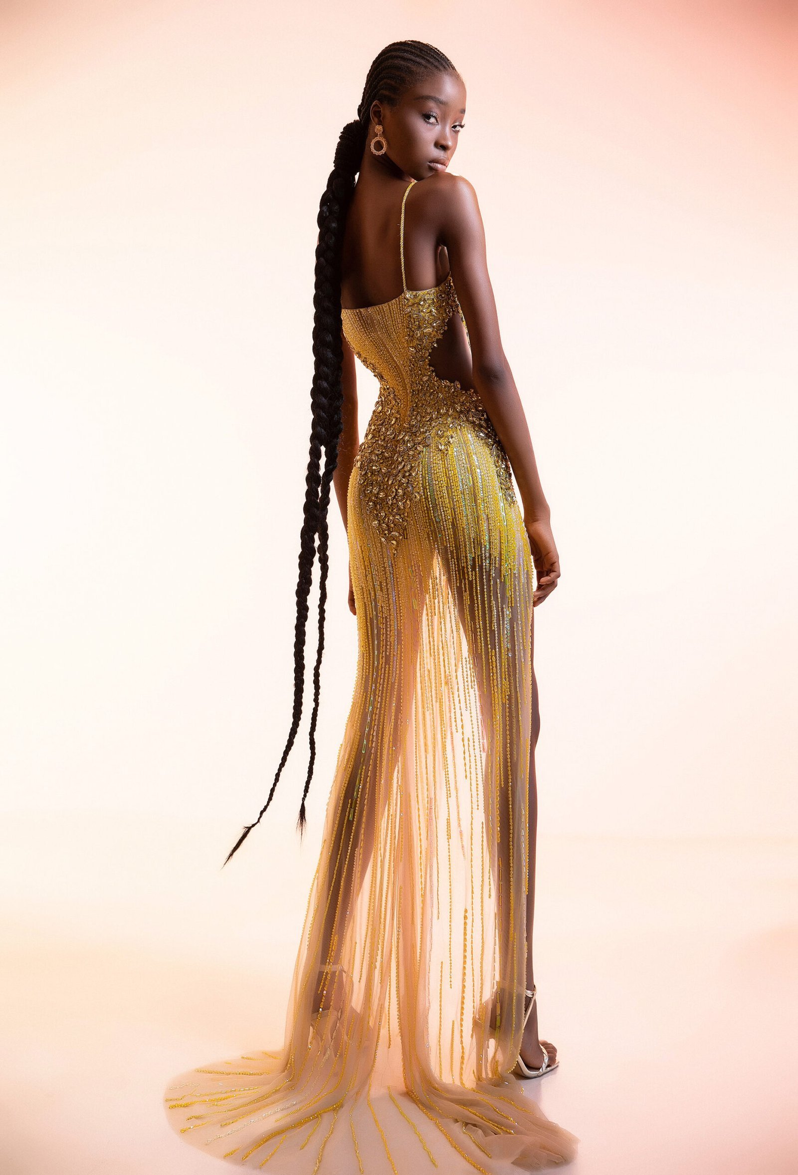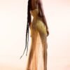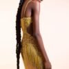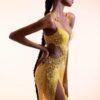 This breathtaking gown is a radiant masterpiece, featuring a semi-sheer silhouette adorned with intricate, hand-beaded details that create a sunburst effect. The dress is a stunning blend of pale yellow and gold, with a deep V-neckline and a high slit that adds a touch of modern allure. The cascading fringe embellishments create mesmerizing movement and sparkle with every step.