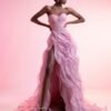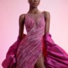 Rose Pink Beaded Tulle Evening Gown with Deep V-neckline & High Slit