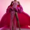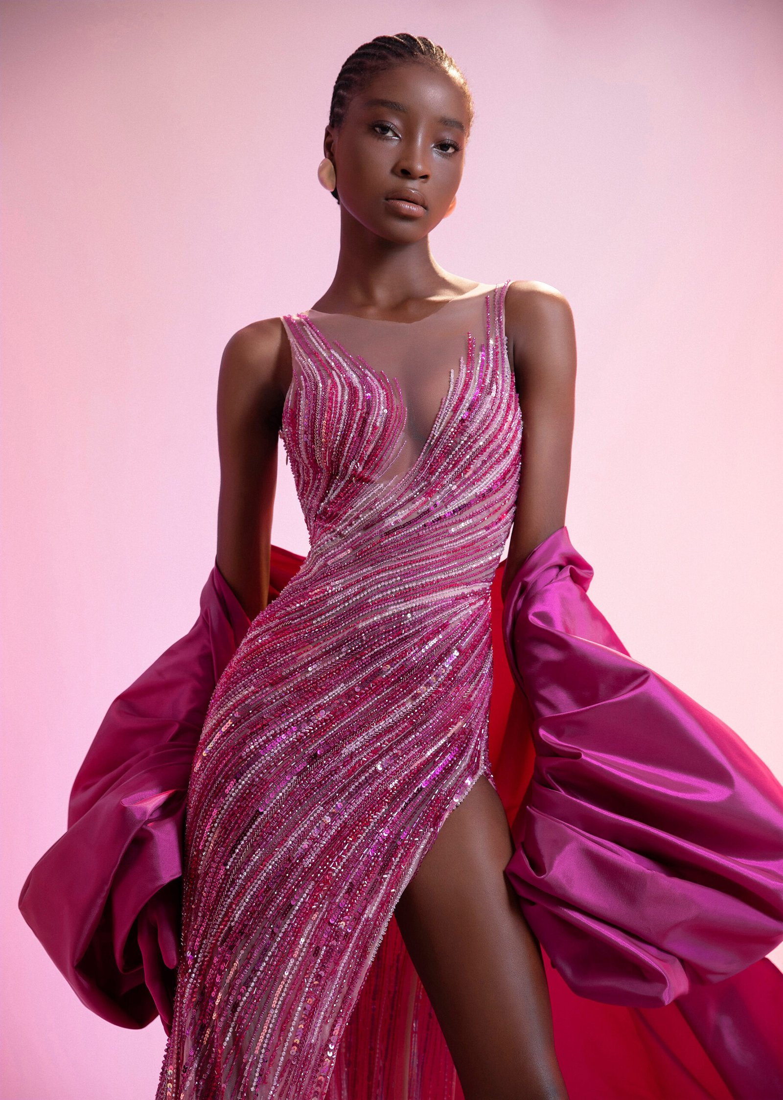 The dress features a deep V-neckline and a fitted, body-hugging silhouette. It is entirely covered in exquisite beadwork, which creates a mesmerizing, shimmering effect. A high side slit adds a daring, modern touch.