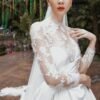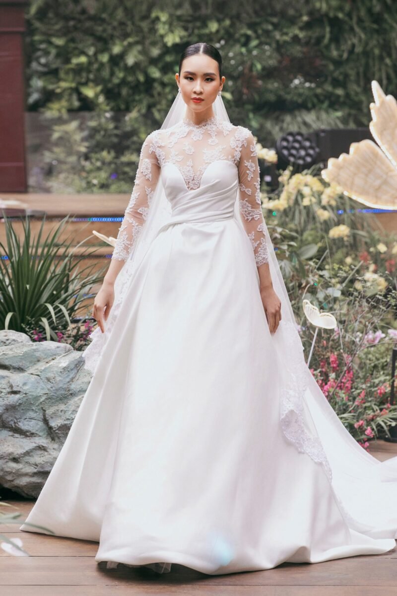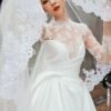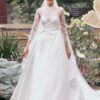 This wedding gown, designed in a graceful A-line silhouette, is crafted from luxurious satin and layered with delicate sheer tulle. Intricate details are meticulously embellished with fine lace, Swarovski crystals, and sparkling rhinestones, creating a look of timeless elegance and enchanting allure.
