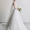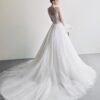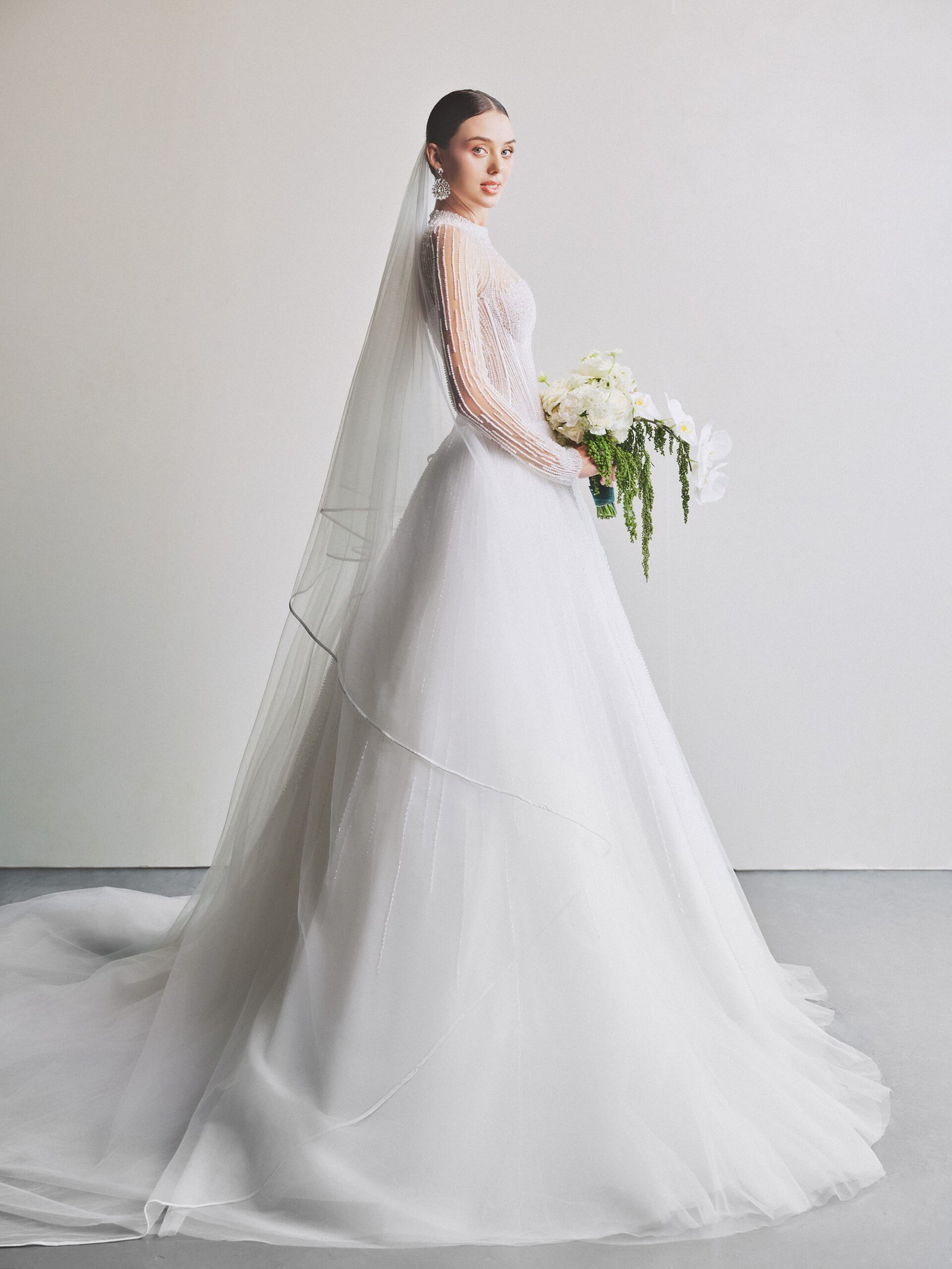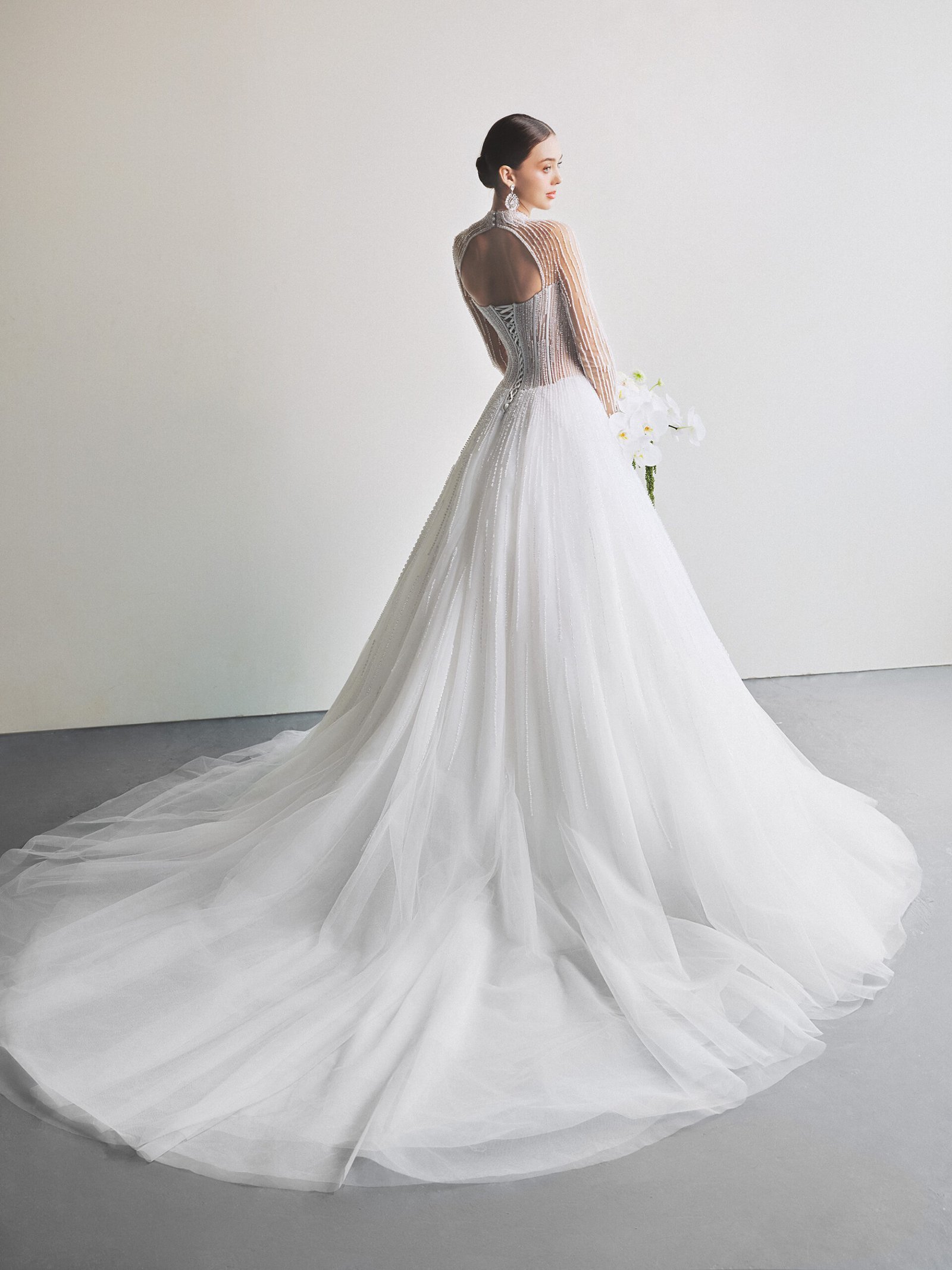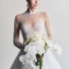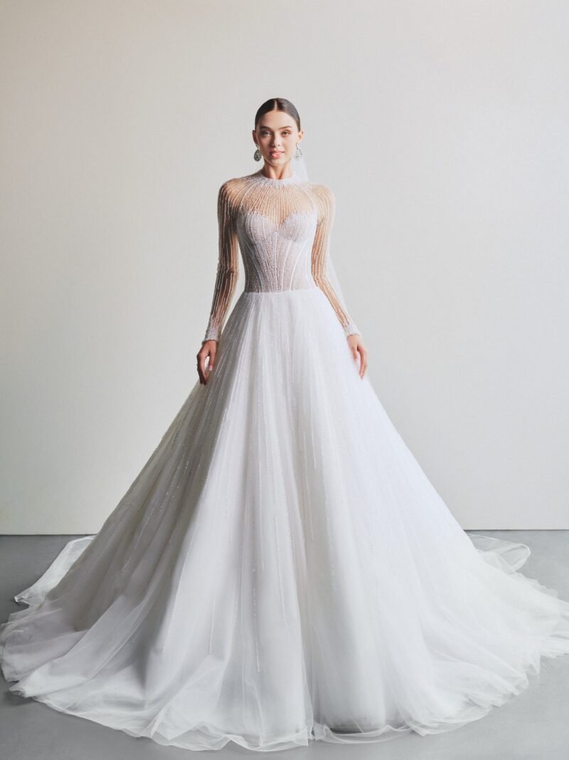 The gown features an elegant A-line silhouette with a refined waistline that accentuates the bride’s graceful figure. Crafted from premium soft tulle, the brand’s master artisans dedicated hundreds of hours to hand-embellishing shimmering crystals across the entire fabric.