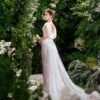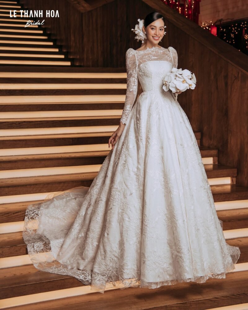 A timeless bridal gown designed in a graceful A-line silhouette that exudes effortless elegance. The highlight lies in the luxurious Chantilly lace overlay cascading from top to hem, creating a magnificent and refined look. Subtly puffed shoulders combined with a sharply tailored waistline enhance the structure of the gown, completing a modern yet sensual appearance for the bride.