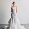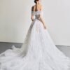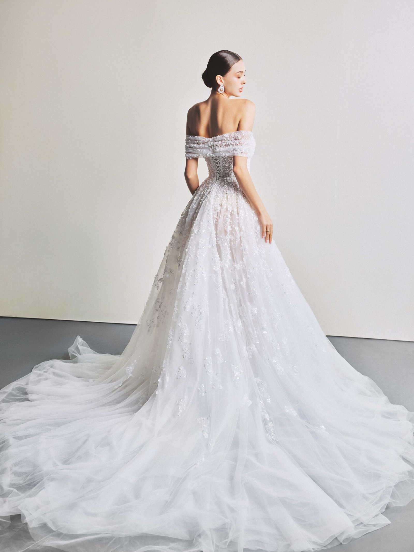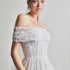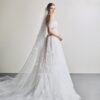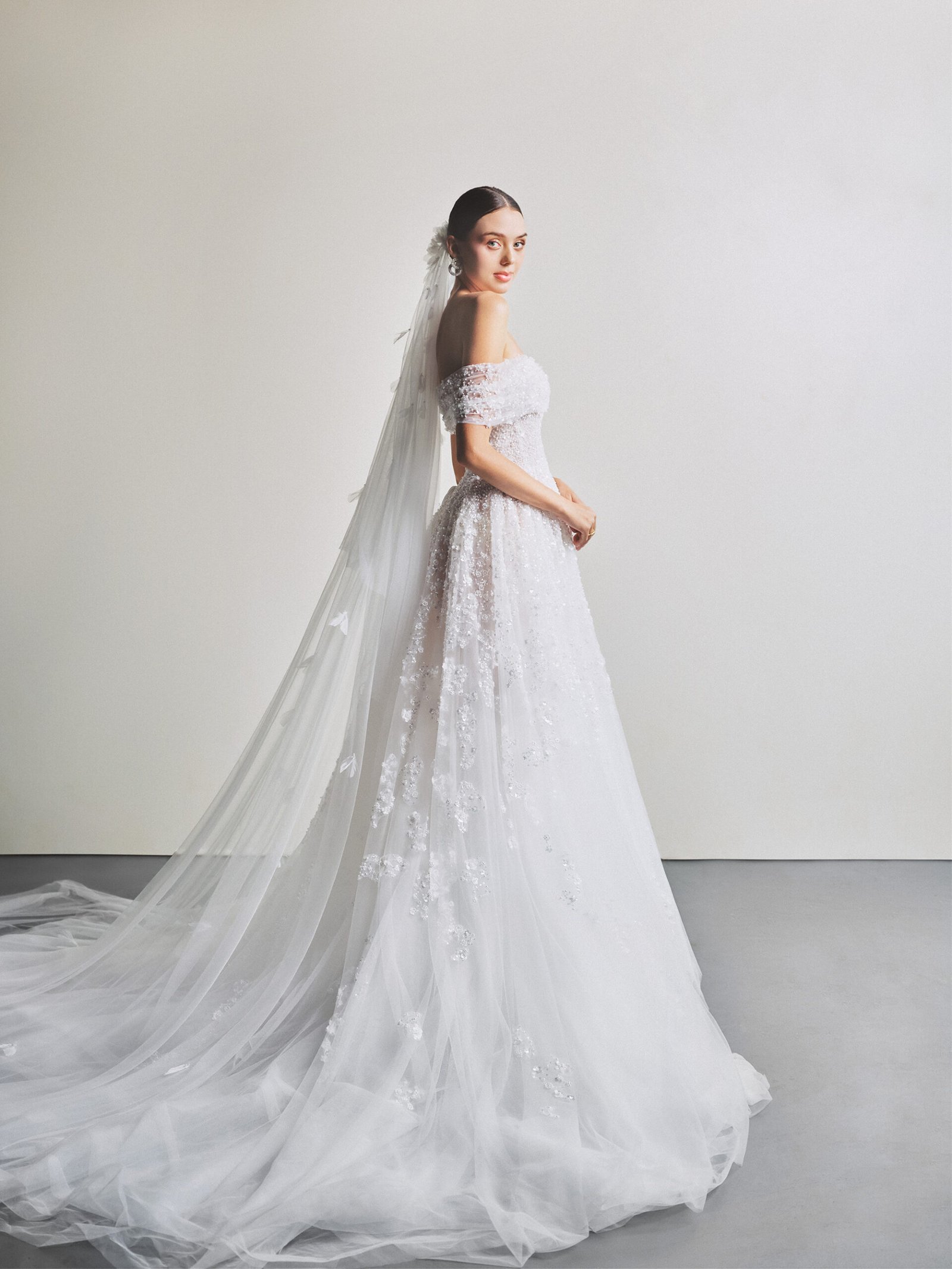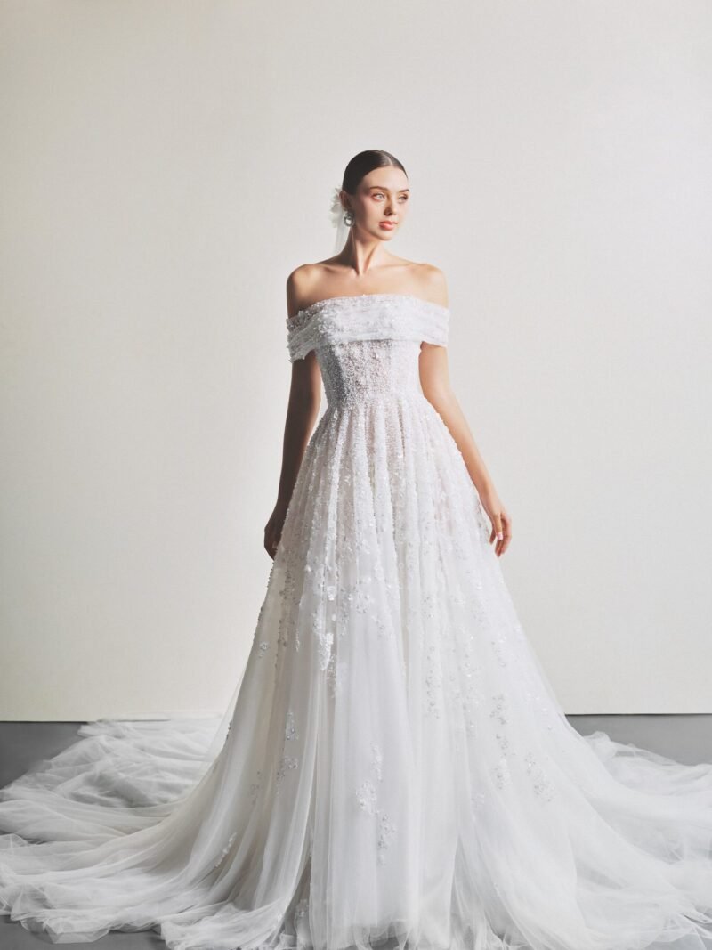 Crafted from lightweight, flowing tulle with a smooth and airy texture, designer Le Thanh Hoa adorned the gown with delicate falling floral embellishments and shimmering crystal details. The A-line silhouette paired with romantic off-shoulder sleeves evokes a sweet elegance that is certain to capture every bride’s heart.