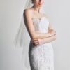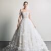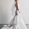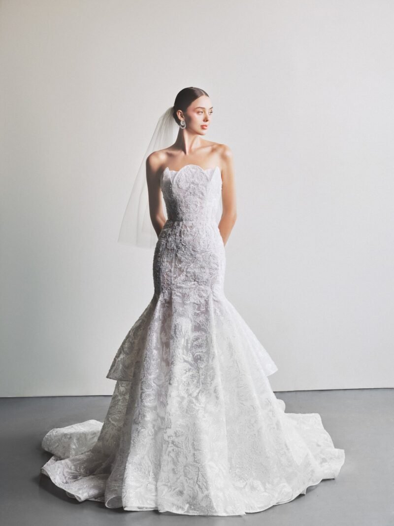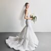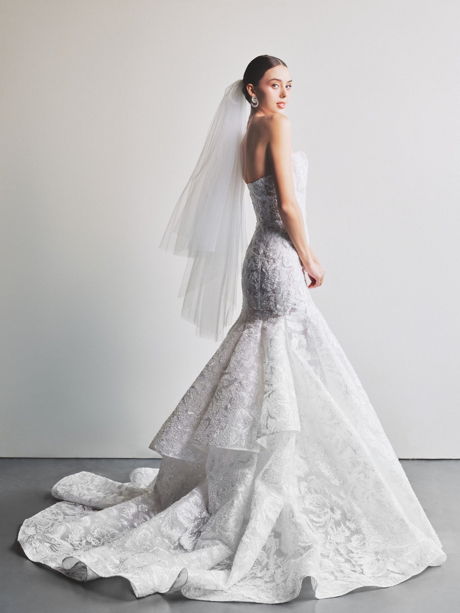 The delicate and graceful lines of the gown resemble peony petals blossoming under the morning sunlight, with every detail meticulously crafted to capture the flower’s purity and charm. The mermaid featuring a luminous foil embossed fabric that beautifully reflects the light, the design is completed with a youthful strapless neckline.